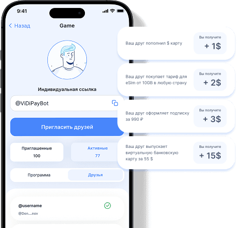 Приглашайте друзей в mini app Telegram, делитесь эмоциями от путешествий в соцсетях и получайте бонусы в USD за их активность.